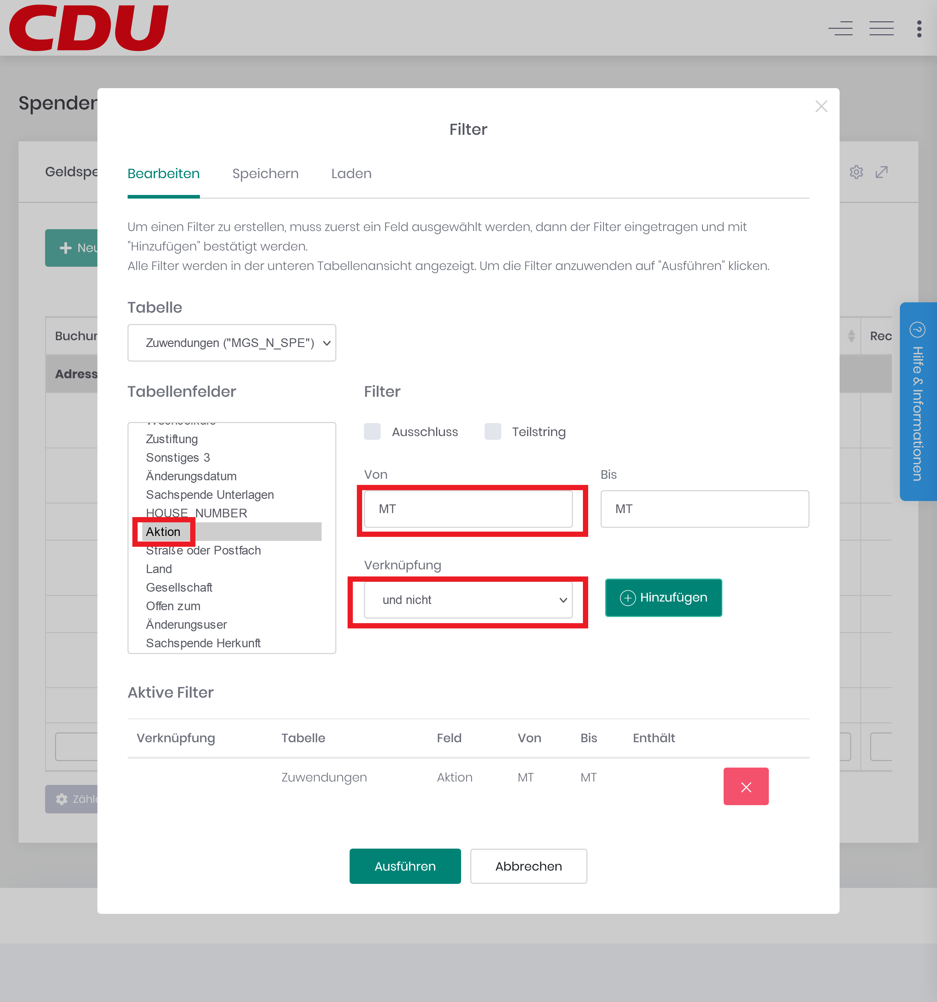 Durch die Selektion und Eingabe von Tabelle "Zuwendungen", dem Tabellenfeld "Aktion", von "MT", bis bleibt leer, Verknüpfung "und nicht", klick auf "+Hinzufügen", werden alle Spendeneingänge angezeigt, die nicht Mandatsträgerbeiträge sind.