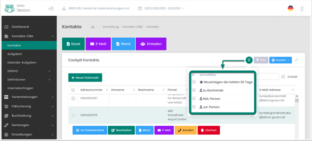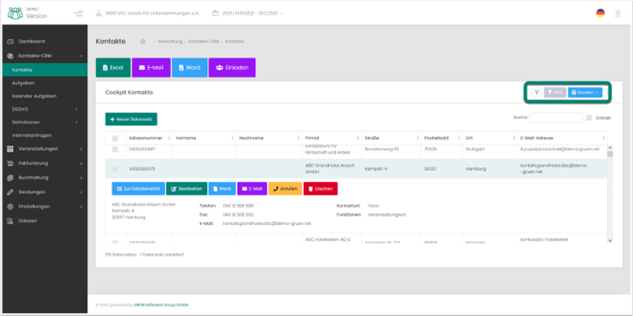 Darüber hinaus sind hier zusätzlich die Schaltflächen zur individuellen Filterung (Filter) und Schalter zum Aktivieren und Deaktivieren vorkonfigurierter „Schnellfilter“ verortet.