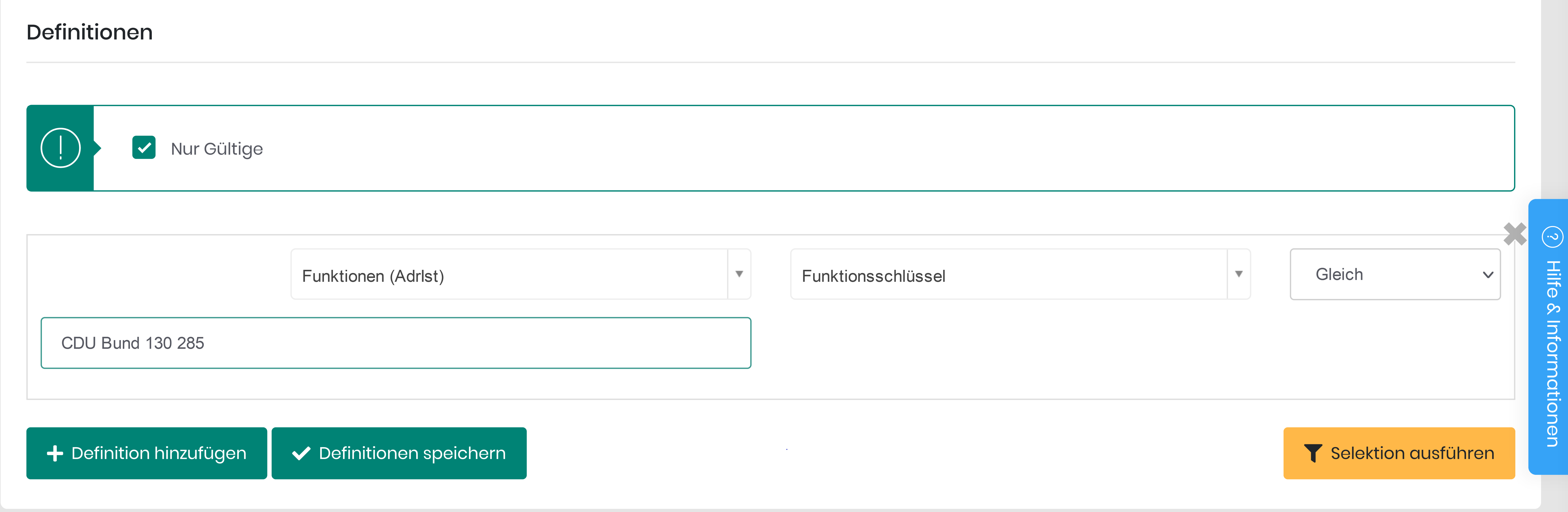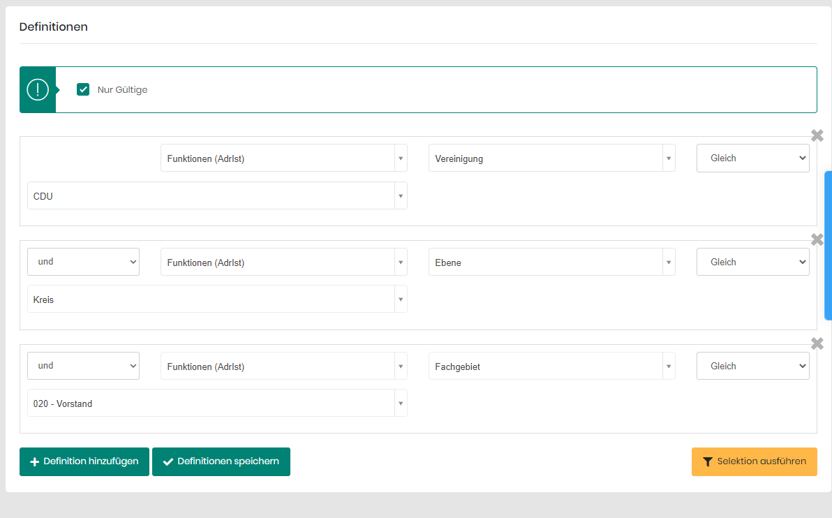 2. Sie können einen Funktionsschlüssel auch in detaillierter Form angeben. Dies kann vor allem dann genutzt werden, wenn Sie nur bis zur Fachebene selektieren möchten, z.B. der gesamte CDU-Vorstand auf Kreisverbandsbene: